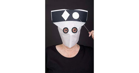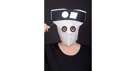 Which One Suits Best? Hair is the last project and questions the beauty industry’s fixation on choosing the right hairstyle for a face’s shape. Vicky Hodgson wears a paper bag mask with a black outline of hair and uses white geometric shapes to challenge this obsession. By holding circles on sticks on one side of the hair and putting various other geometric shapes on the other side, she asks, “Which One Suits Best?”